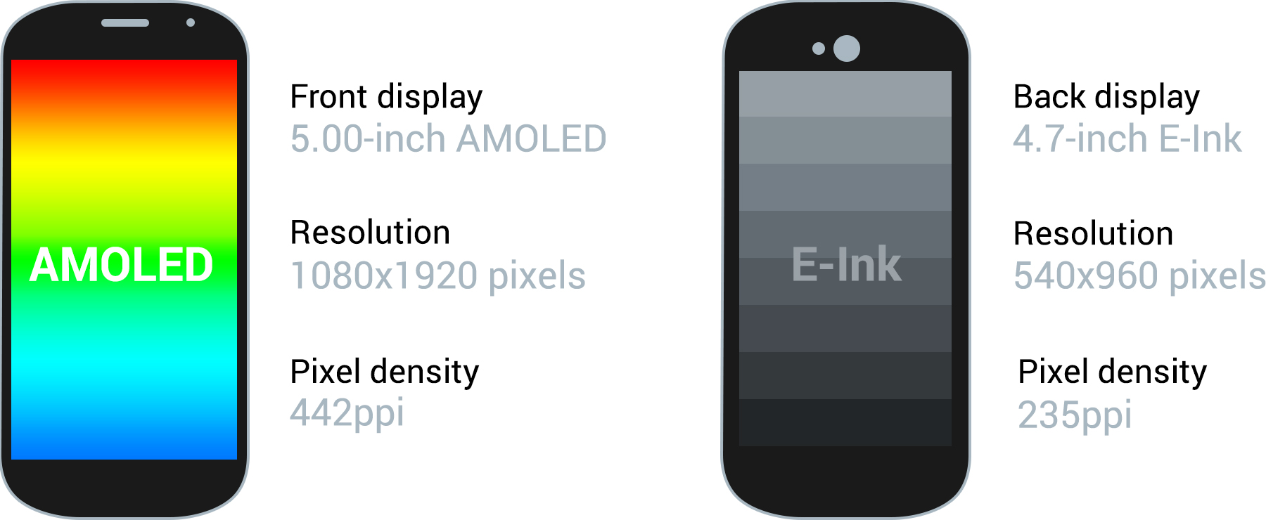 это новое поколение двустороннего телефона с современным дизайном, более мощным процессором и e-ink дисплеем с тач-панелью, полностью покрывающей его поверхность. E-ink дисплей всегда включен, поэтому пользователь может видеть уведомления и другую важную информацию, пока основной экран находится в спящем режиме.